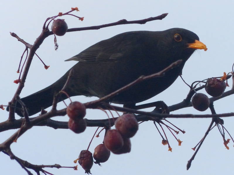Meestal zit de merel niet op voedertafels maar op de grond.